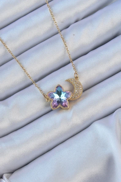 316L Çelik Zincir Altın Renk Ay Tasarımlı Renkli Zirkon Taşlı Çiçek Kolye