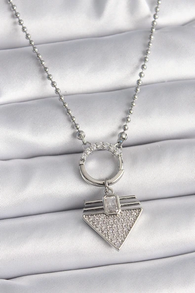 316L Çelik Gümüş Renk Topçuk Zincir Zirkon Taşlı Üçgen Model Kadın Kolye