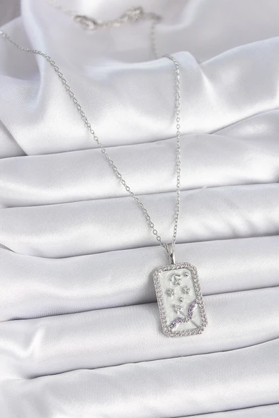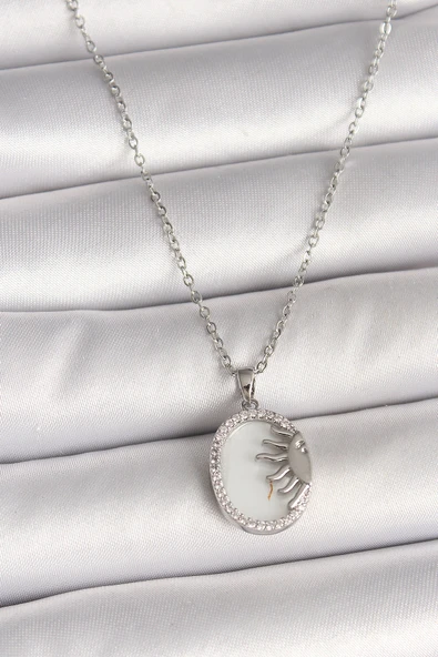 316L Çelik Gümüş Renk Zincir Zirkon Taşlı Ay Güneş İşlemeli Madalyon Model Kadın Kolye