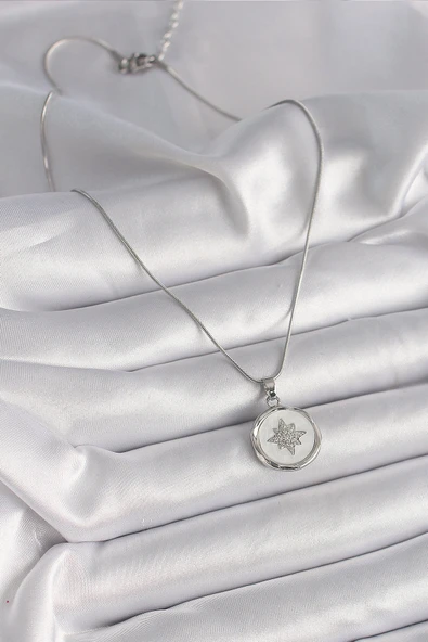 316L Çelik Gümüş Renk Zincir Zirkon Taşlı Kutup Yıldız İşlemeli Madalyon Model Kadın Kolye