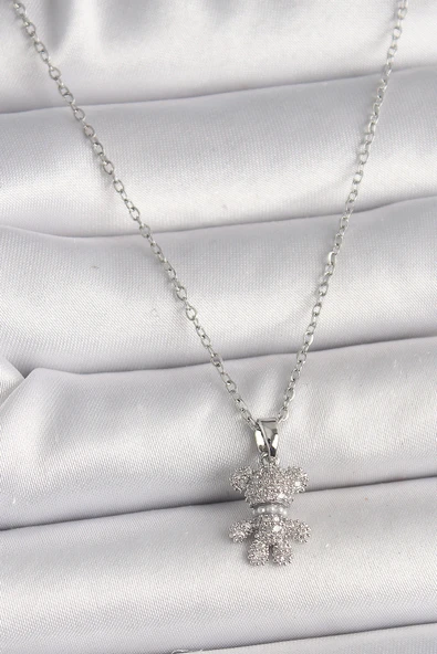 316L Çelik Gümüş Renk Zincir Zirkon Taşlı Ayıcık Figür Kadın Kolye
