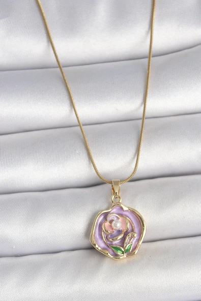 316L Çelik Gold Renk Zincir Mor Renkli Çiçek İşlemeli İnci Detay Portre Model Kadın Kolye