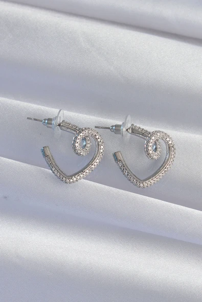 Pirinç Gümüş Renk Zirkon Taşlı Kıvrımlı Yarım Kalp Küpe