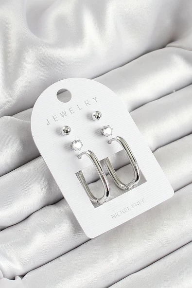 Pirinç Zirkon Taş Ve Dikdörtgen Figürlü Gümüş Renk 3'lü Çift Kadın Küpe Set