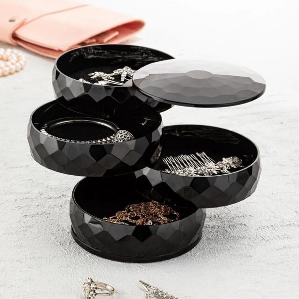 360 Derece Dönebilen 4 Katlı Takı - Toka - Küpe-Bileklik Organizer - Siyah