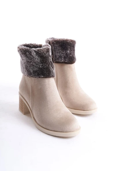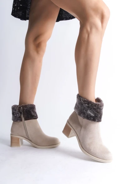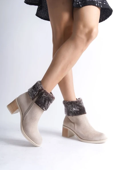 KATYA Fermuarlı Ortopedik Taban Topuklu Kürk Detaylı Süet Kadın Bot STT - Ten