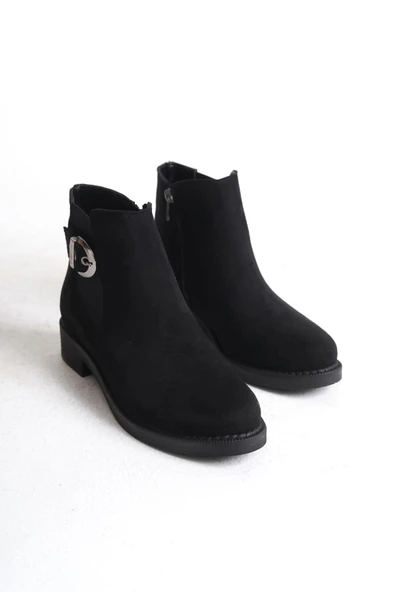 ALMILA Fermuarlı Lastikli Ortopedik Taban Topuklu Süet Kadın Bot SST - Siyah