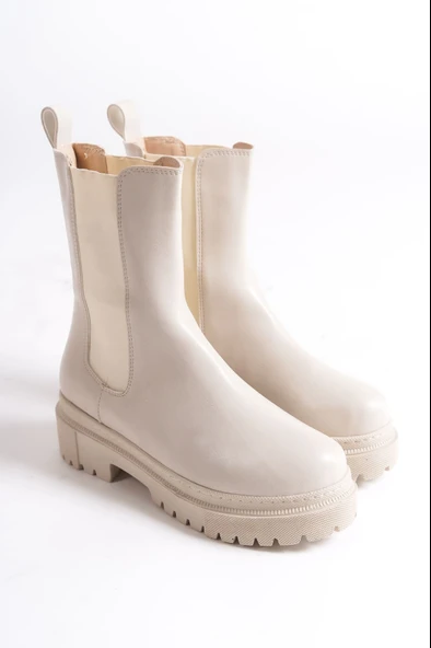 ALMILA Fermuarlı Lastikli Ortopedik Taban Topuklu Kadın Bot CKT - Krem