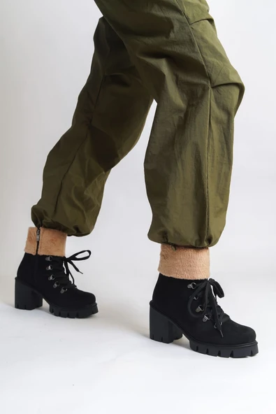 DIANA Bağcıklı Fermuarlı Ortopedik Taban Topuklu Süet Kadın Bot SST - Siyah