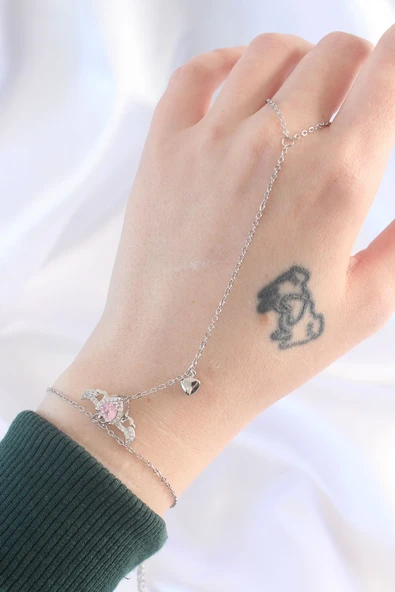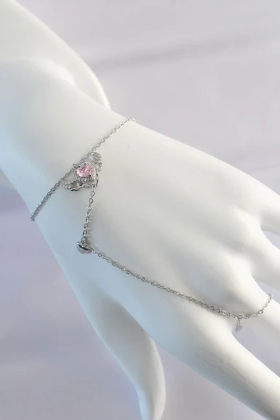 316L Çelik Gümüş Renk Pembe Zirkon Taşlı Kalp Şahmeran