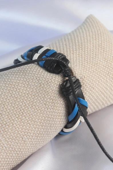 Mavi Beyaz Renk Siyah Deri İpli Erkek Bileklik