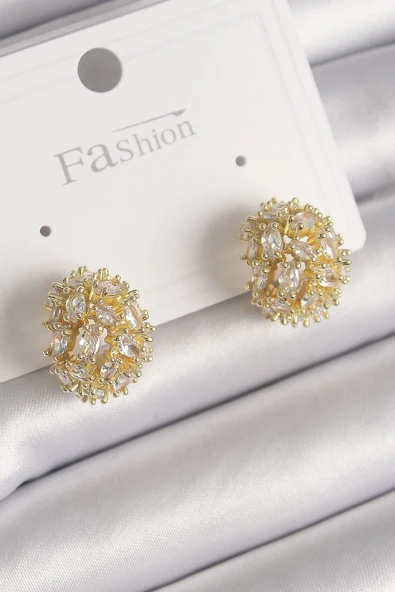Pirinç Gold Renk Zirkon Taşlı Kadın Küpe