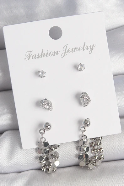 Pirinç Zirkon Taşlı Sallantılı Model Gümüş Renk 3'lü Çift Kadın Küpe Set
