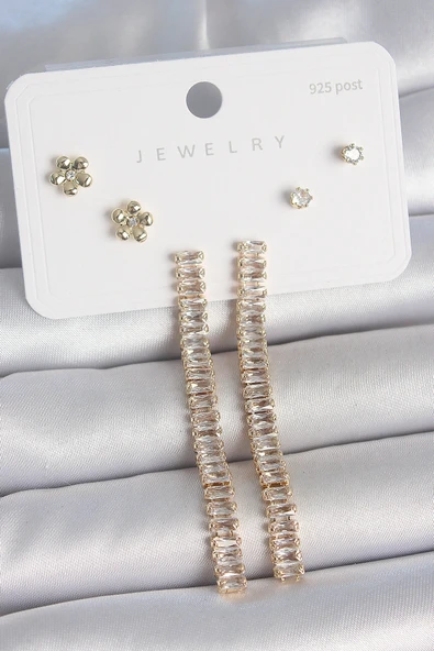 Pirinç Zİrkon Taşlı Kalp Model Gold Renk 3'lü Kadın Küpe