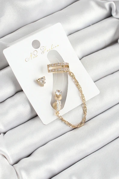 Pirinç Üçgen Figürlü Zirkon Taşlı Gold Renk 3'lü Kıkırdak Kadın Küpe Set