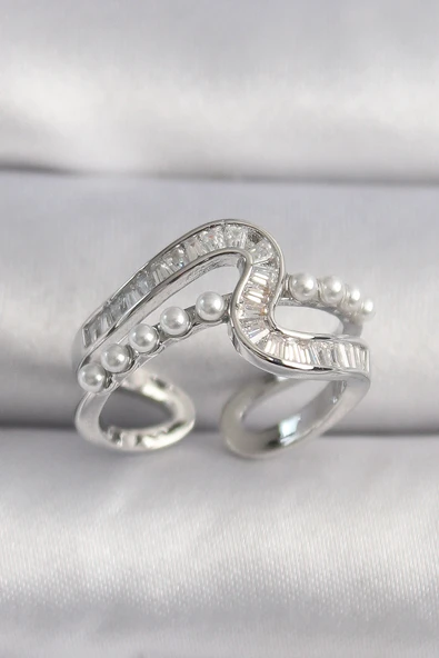 Pirinç Gümüş Renk Zirkon Taşlı İnci Detay Kadın Yüzük
