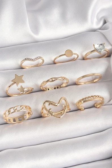 Pirinç Gold Renk Zirkon Taş Detaylı Kalp Yıldız Figür Kadın Yüzük Kombini