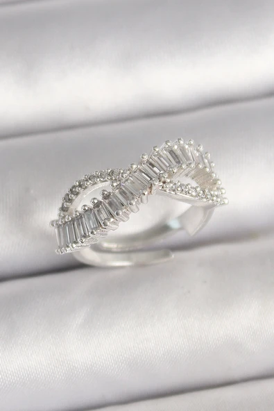 Pirinç Gümüş Renk Su Yolu Zirkon Taşlı Ayarlanabilir Model Kadın Yüzük