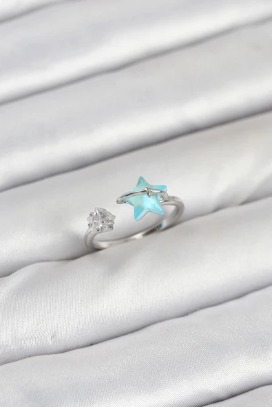 Pirinç Gümüş Renk Mavi Yıldızlı Model Kadın Yüzük