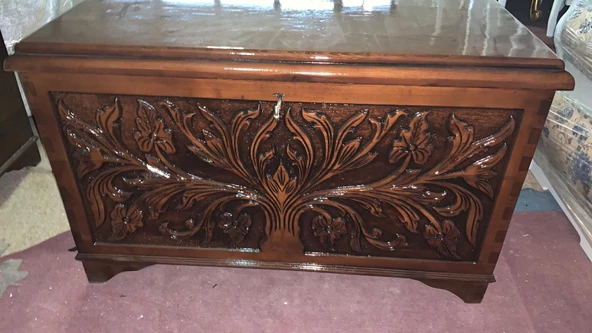 Çeyiz SANDIK 12961 Ahşap Kayın El Oyma Model Kilitli Parlak ceviz natüre El Yapım