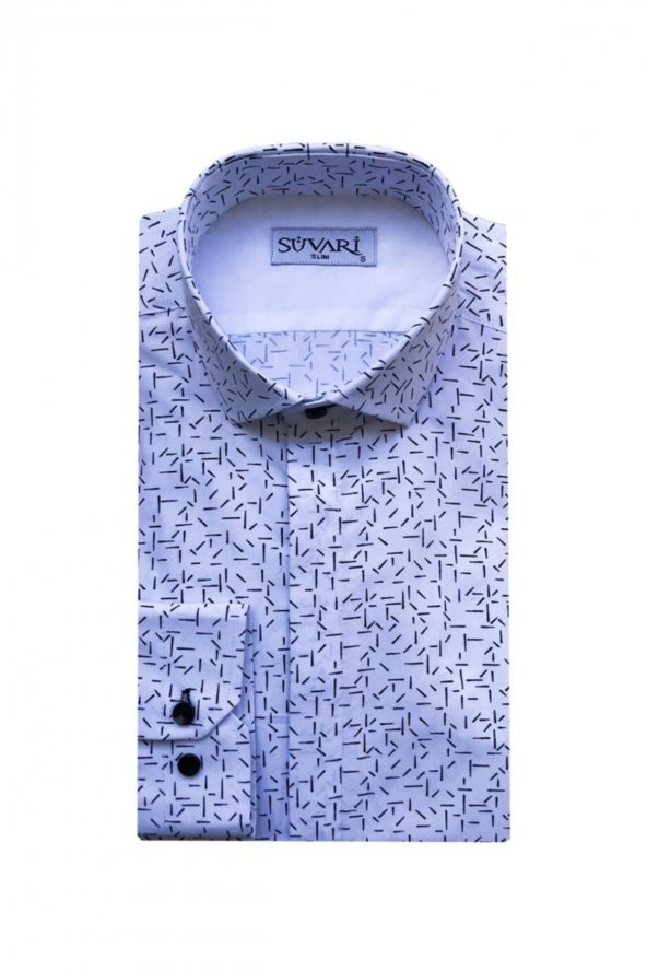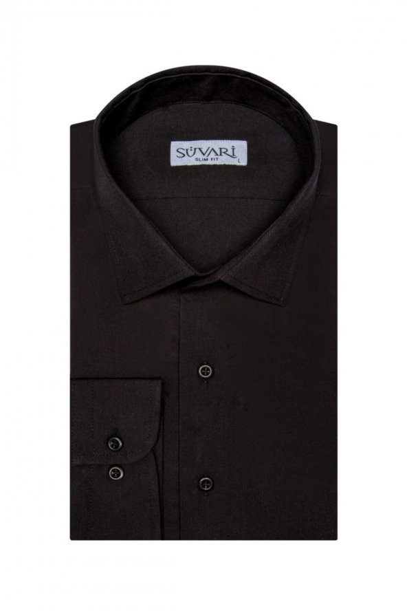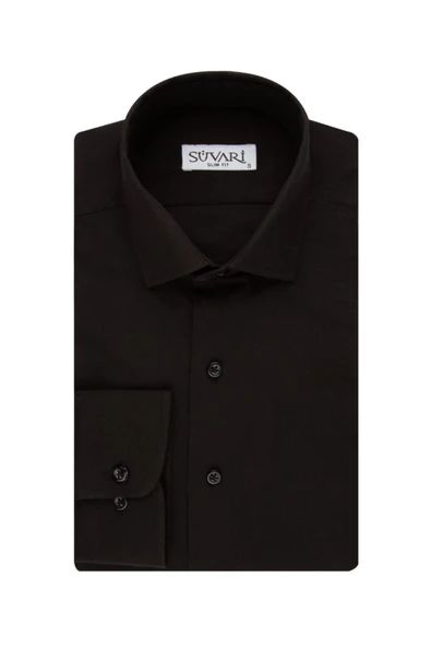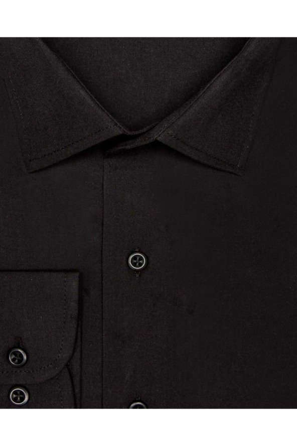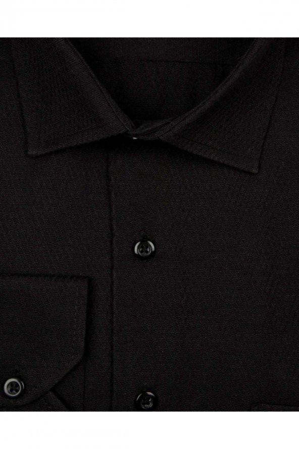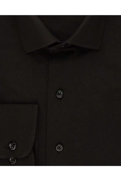 Slim Fit Baskılı Uzun Kol Gizli Düğme Detaylı Siyah Gömlek