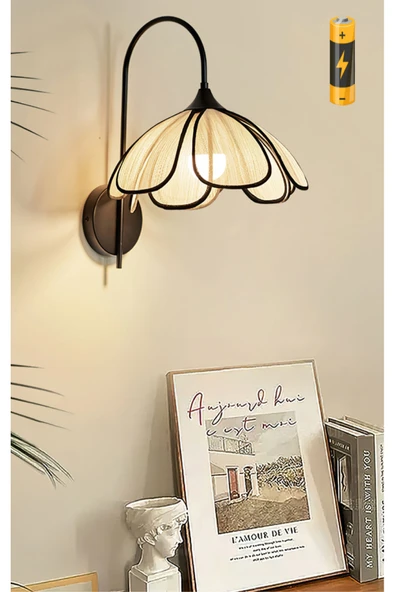 burenze Modern Tasarım Rose Çiçek Kablosuz Pilli Aplik Siyah Gövde Aç Kapa Butonlu Tak Çalıştır Ekru Kumaş