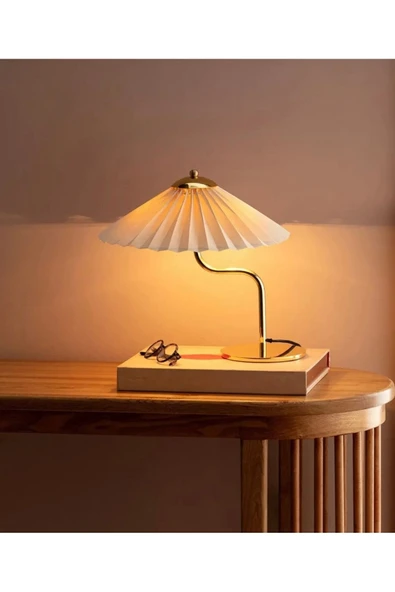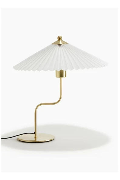 burenze Modern Tasarım Umbrella Abajur 2’li Set Eskitme Gold Masa Lambası Krem Kumaş Pileli Abajur