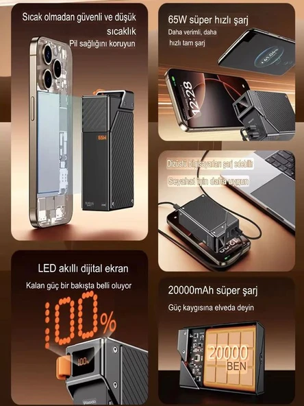 ÇELİKWORK 10000mAh PD Kablolu 22.5W Kablosuz Wireless 15W Dahili USB Micro TYPE-C iPhone Powerbank