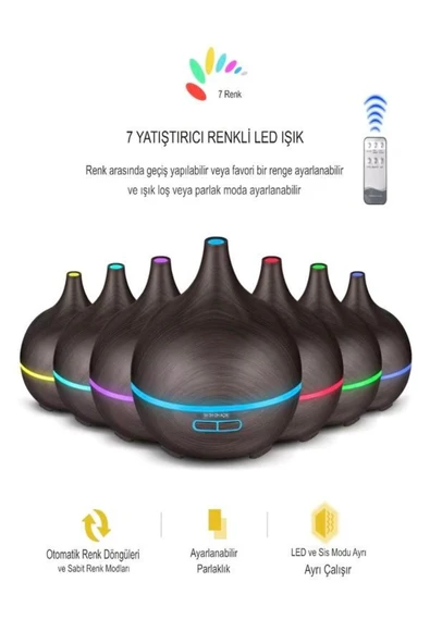 DEANB 500ml Kumandalı Ahşap Desenli Aroma Difüzör – 7 Renk LED, RGB Işıklı Hava Nemlendirici