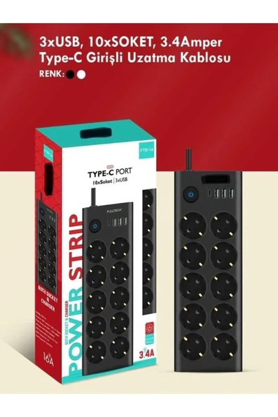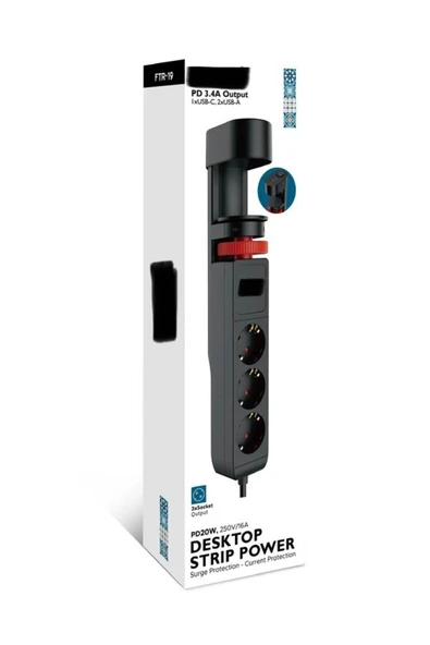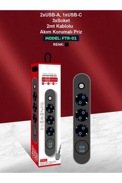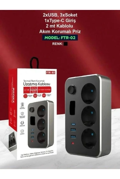 çelikwork inspiring technology FTR-1 2500Watt 2USB 1Type-C 10A Akım Korumalı 3'lü 2M Kablolu Siyah Çoklu Priz