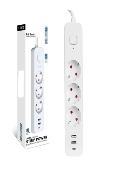 ÇELİKWORK FTR/16 3680W 16A 3 Priz, 2 USB, 1 Type-C, 1.8 Metre Akım Korumalı Priz