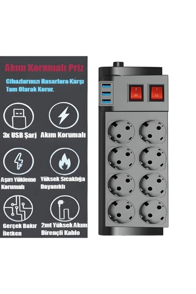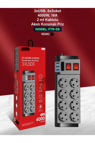 ÇELİKWORK Ftr008 4000watt 16a Akım Korumalı 2 Anahtarlı Priz 8'li Priz 3'usb 2metre Kablo Çoklayıcı