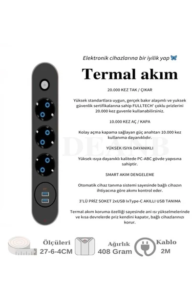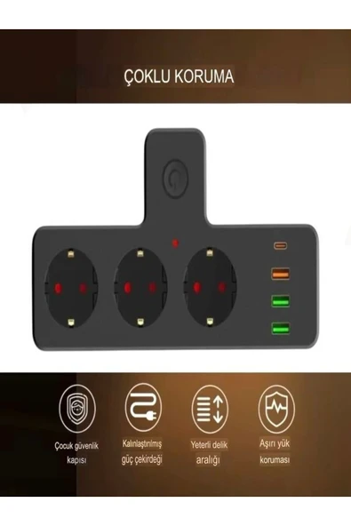 DEANB 3680W 3.4A 2xUSB 1xType-C Alman Akım Korumalı Saf Bakır 3’lü Priz Çoklayıcı 1050J