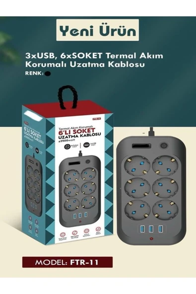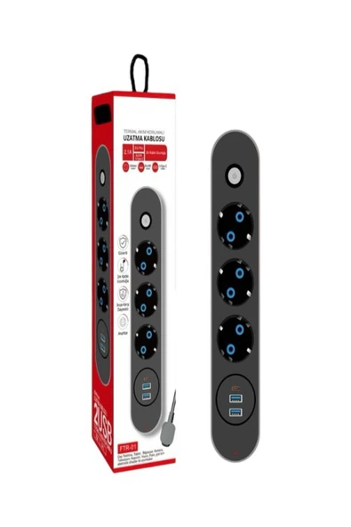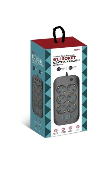 ÇELİKWORK FTR11 3xUSB 6xSOKET Termal Akım Korumalı 2 Metre Uzatma Kablolu Anahtarlı Çoklu Priz