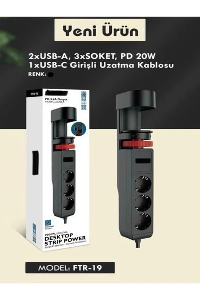 ÇELİKWORK Masa Tutacaklı Akım Korumalı 2xusb-a, 3'lü Priz, Pd 20w 1usb-c Tepe-c Çoklayıcı Tutacaklı Priz