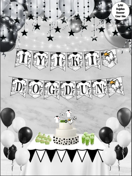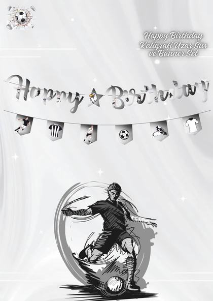 Siyah Beyaz Taraftar Happy Birthday Kaligrafi ve Banner Set