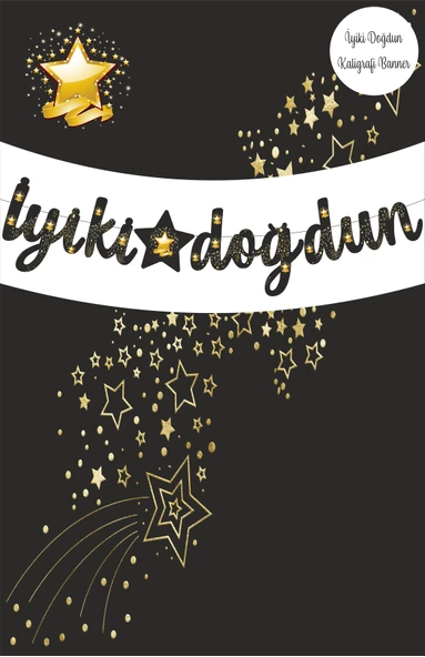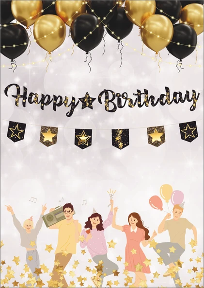 Yıldız Siyah Altın Happy Birthday Kaligrafi ve Banner Set