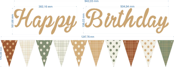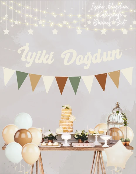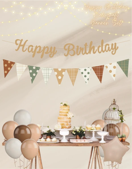 Sütlü Kahve Happy Birthday Kaligrafi Banner ve Desenli Flama Set