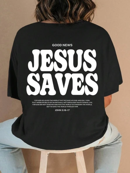 Baskılı Oversize Bisiklet Yaka T-shirt - Siyah