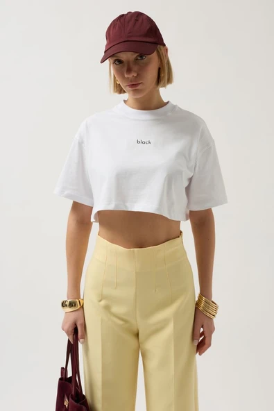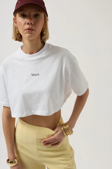 Fiyonk Baskılı Oversize Bisiklet Yaka T-shirt - Beyaz
