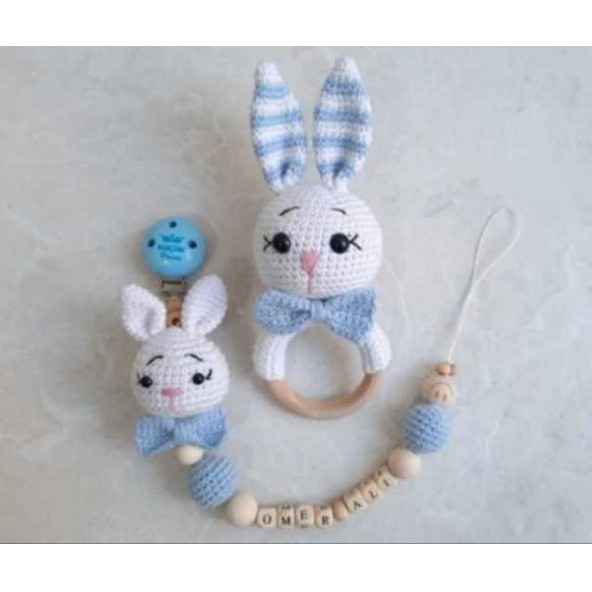 Mavi beyaz tavşan çıngırak seti yenidoğan bebek hediyesi organik oyuncak isimli emzik Zinciri aksesuarları