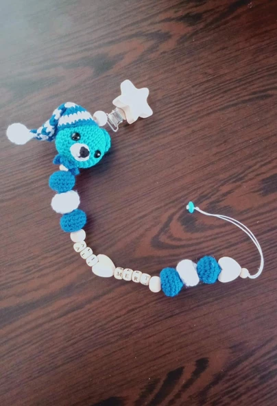 Amigurumi mavi ayıcık İsimli Emzik Zinciri yenidoğan bebek hediyesi isme Özel