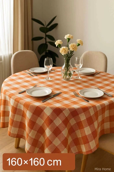 Fiber Kareli Masa Örtüsü Sofra Bezi Ekose Desen 160x160 Cm Turuncu