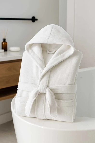Beyaz Gramajlı Kapşonlu Garson Boy Çocuk Banyo Bornozu