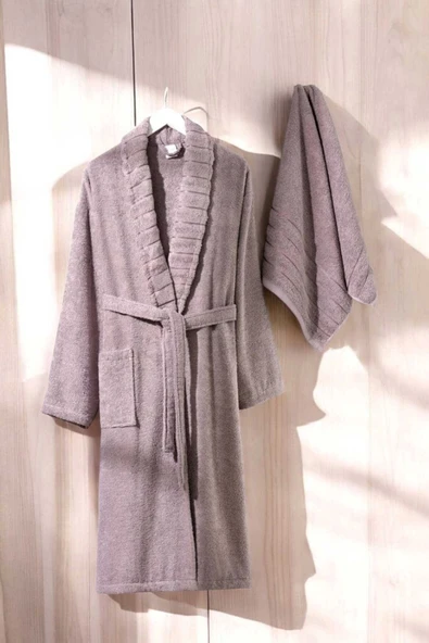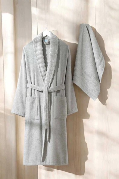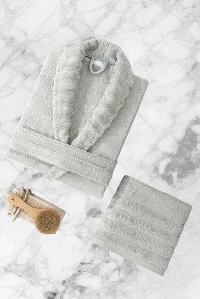 AquaLoom Lüx Bornoz ve Havlu Seti %100 Pamuklu Açık Gri