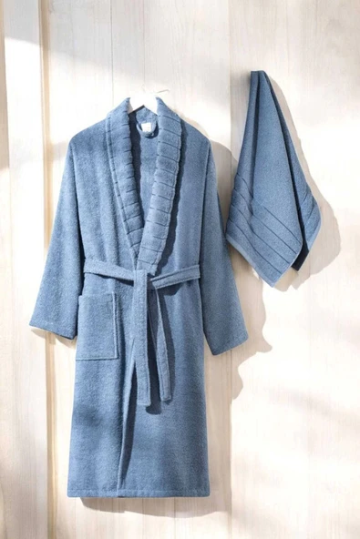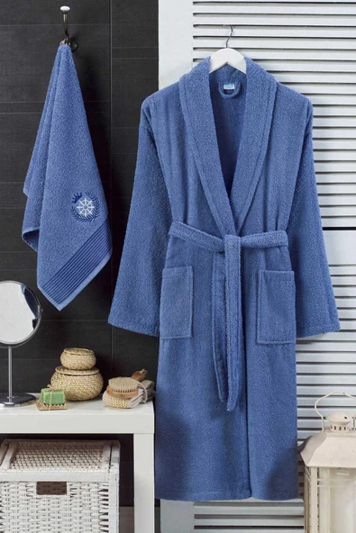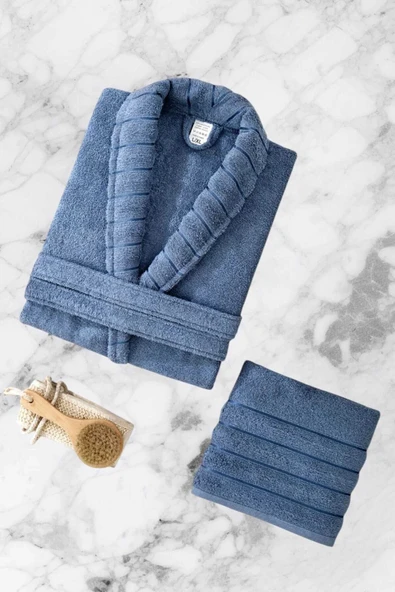 AquaLoom Lüx Erkek Bornoz ve Havlu Seti %100 Pamuklu Mavi
