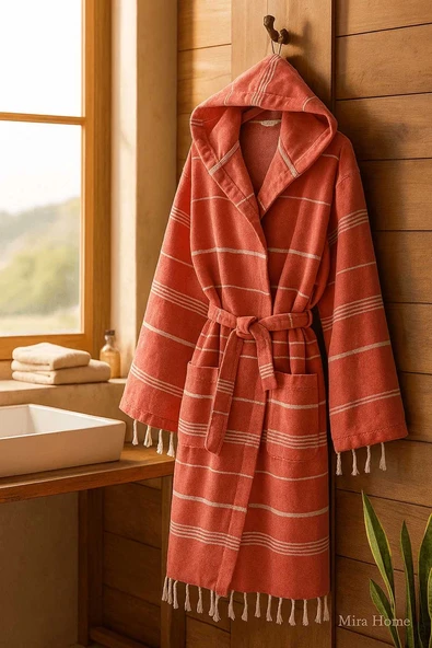 Kapşonlu Çizgili Unisex Banyo Plaj Peştemal Bornozu %100 Pamuklu Linetouch Kiremit
