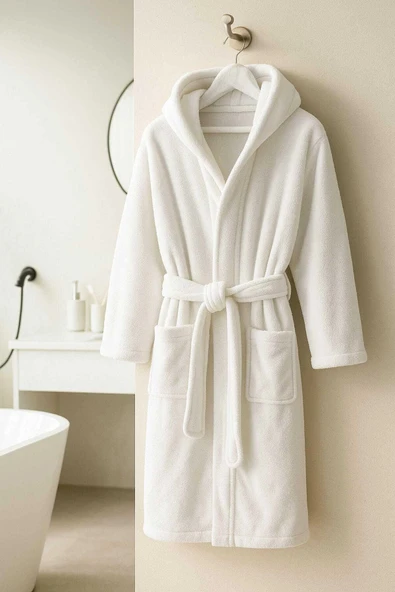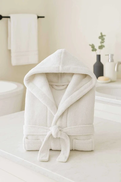 Kapüşonlu Unisex Banyo Bornozu %100 Soft Pamuklu Krem