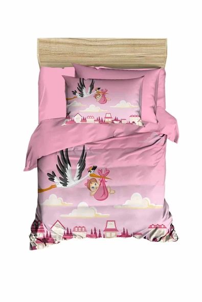 Yenidoğan Kız Bebek Nevresim Takımı %100 Pamuklu Leylek