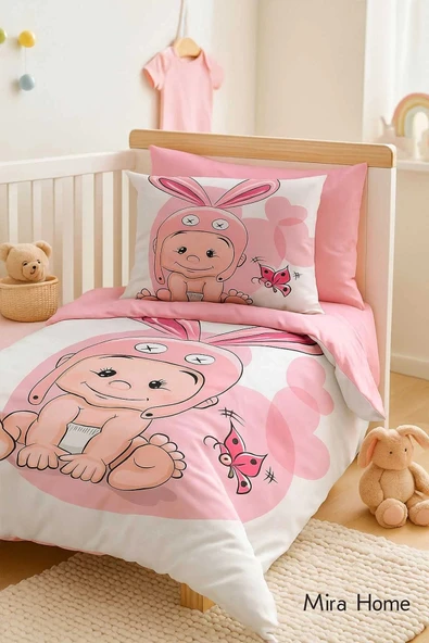 Yenidoğan Kız Bebek Nevresim Takımı %100 Pamuklu Tavşan Kulak